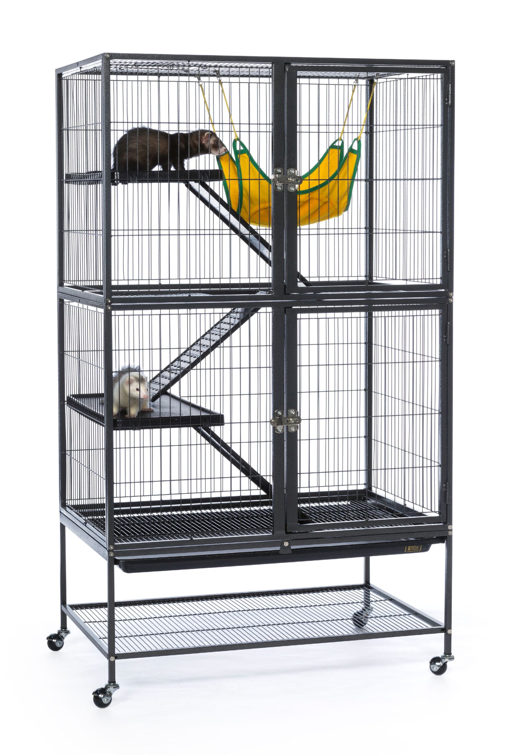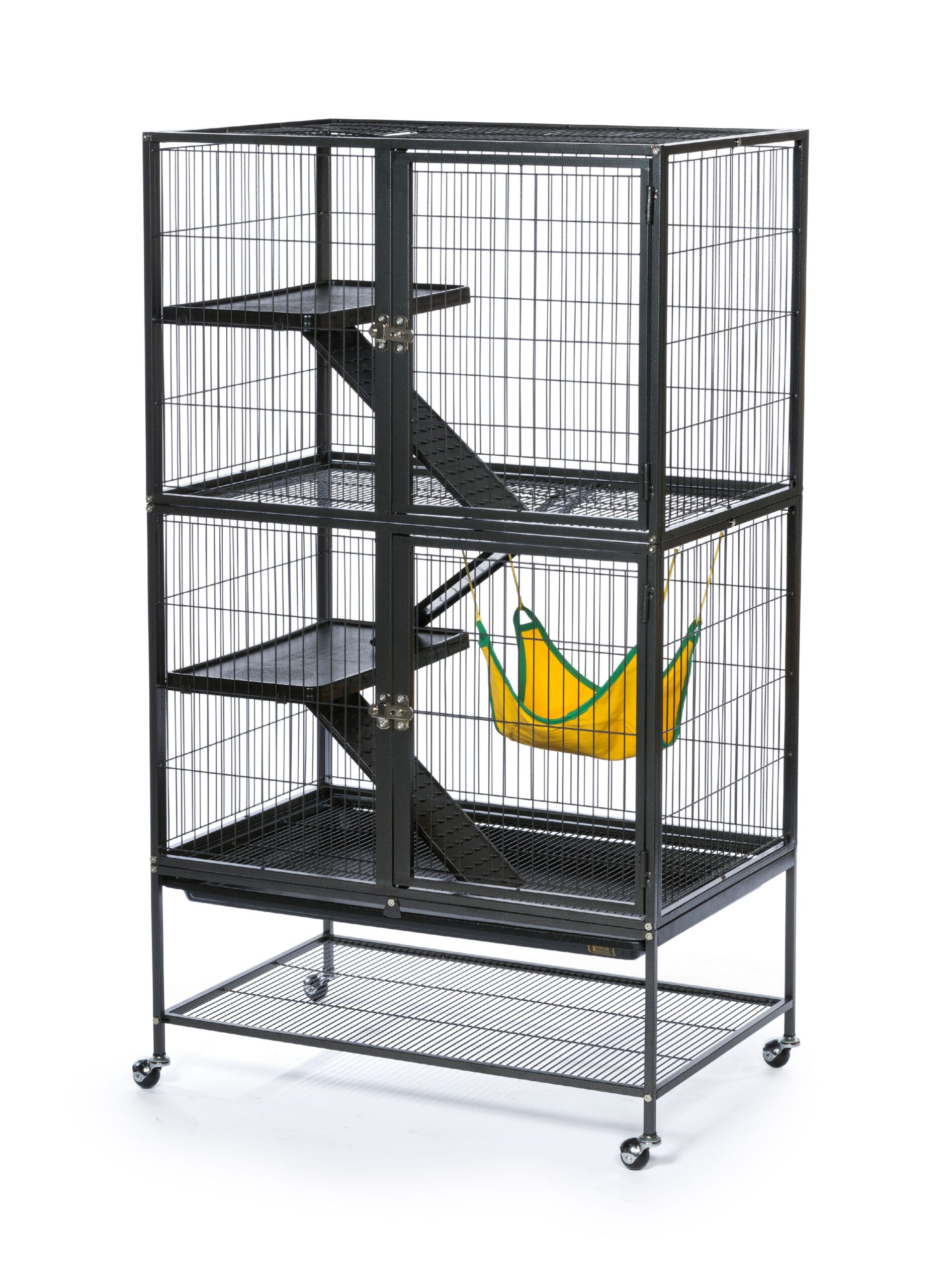 The Prevue Pet Products Feisty Ferret Home with Stand offers plenty of space for even the most energetic ferret to run, jump and play. This complete enclosure comes with ramps so your pet can run up and down from level to level. There are shelves for resting or to use as launching platforms. This feisty ferret cage even has a hammock so your pet can enjoy swinging and napping. It has two large doors that allow you to reach your pet or add food and water. However, your clever ferret will not be able to open the portals. This item features 7/8″ wire spacing for your pet’s security. The platforms, grille and bottom tray are all easily removed for cleaning. The pet cage stand is finished in black hammertone and has casters to provide portability from room to room. Use the bottom shelf to hold toys, treats and supplies.